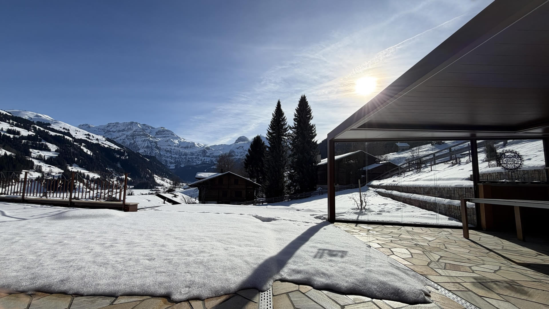 Auch in alpiner Lage bleibt die Terrasse ein nutzbarer Wohnraum. Das individuell geplante Lamellendach in Sonderform schützt vor Schnee und
