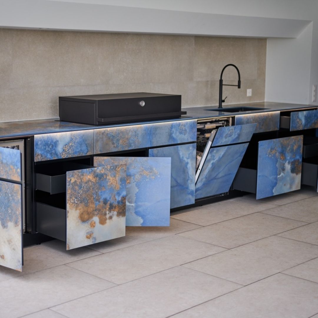 Theiss bietet maximale Flexibilität in der Gestaltung ihrer Küchen. Kunden können aus einer Vielzahl von Materialien und Optionen für Fronten und Arbeitsflächen wählen, und die Module können sogar millimetergenau angefertigt werden