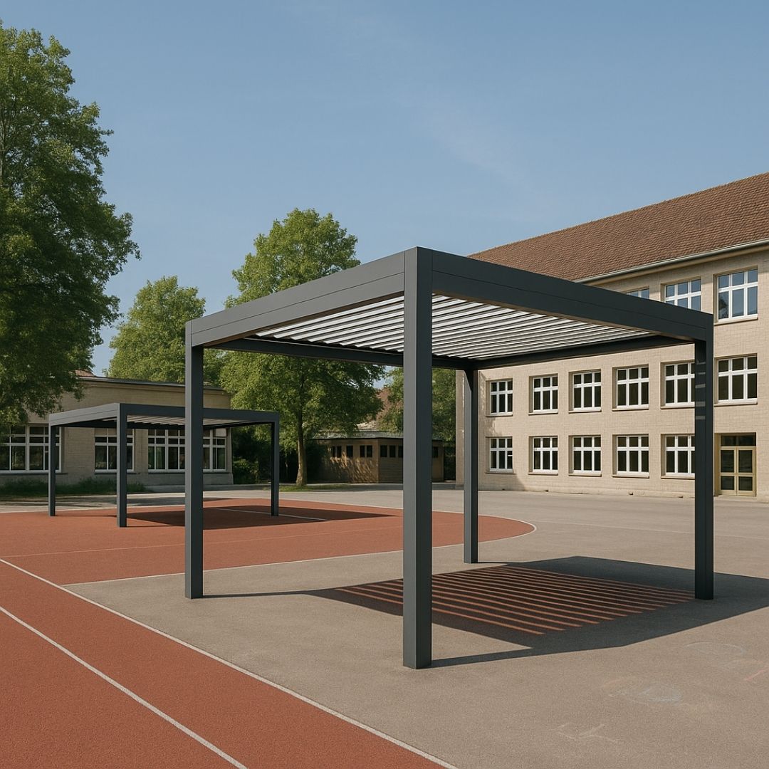 Lösungen für Pausenplätze, Sportbereiche und Eingangsüberdachungen – robust, wetterfest und auf Sicherheit ausgelegt.